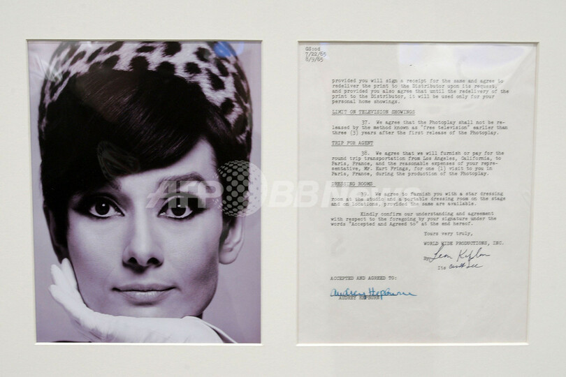 【ニューヨーク/米国 26日 AFP】非営利団体「映画・テレビ基金(Motion Picture & Television Fund、MPTF)」へのチャリティのため、20世紀フォックス(20th Century Fox)は、往年のハリウッドスターたちとの契約書や書簡をはじめとした200点以上の所蔵品をオークションに出品した。出品されたものの中には、オードリー・ヘップバーン(Audrey Hepburn)、エルビス・プレスリー(Elvis Presley)、マリリン・モンロー(Marilyn Monroe)など、豪華スターが名を連ねている。これらの品は25日までスワン・ギャラリー(Swann Galleries)で一般に公開され、オークションが行なわれた。写真は、オードリー・ヘップバーンのサイン入りの契約書。(c)AFP/Getty Images Bryan Bedder