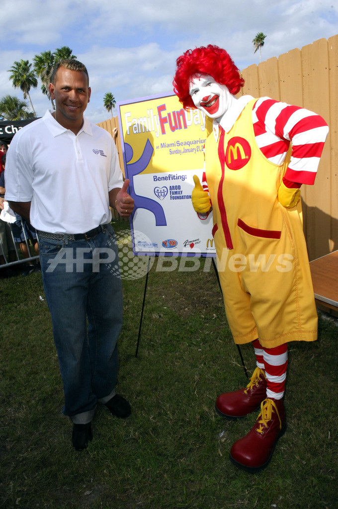 【マイアミ/米国 26日 AFP】チャリティ団体、ARODファミリー・ファウンデーション(AROD Family Foundation)とロナルド・マクドナルド・ハウス・チャリティーズ(Ronald McDonald House Charities)の共催イベント「Family Fun Day」が21日にMiami Seaquariumで開催され、ニューヨーク・ヤンキース(New York Yankees)のアレックス・ロドリゲス(Alex Rodriguez)夫妻が特別ゲストとして参加した。写真はカメラに向かいポーズをとるアレックス・ロドリゲス(左)とロナルド・マクドナルド(Ronald McDonald)。(c)AFP/Getty Images Gustavo Caballero