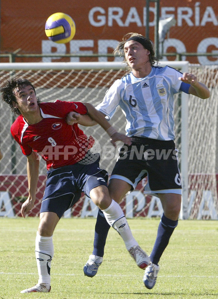 【アスンシオン/パラグアイ 23日 AFP】サッカー、南米ユース選手権(2007 South American Youth Championship)・決勝リーグ、チリvsアルゼンチン。試合は0-0の引き分けに終わり、両チームは勝ち点1を分け合った。写真は、アルゼンチンのマティアス・サンチェス(Matias Sanchez、右)と競り合うチリのアレクシス・サンチェス(Alexis Sanchez)。(c)AFP/Miguel ROJO