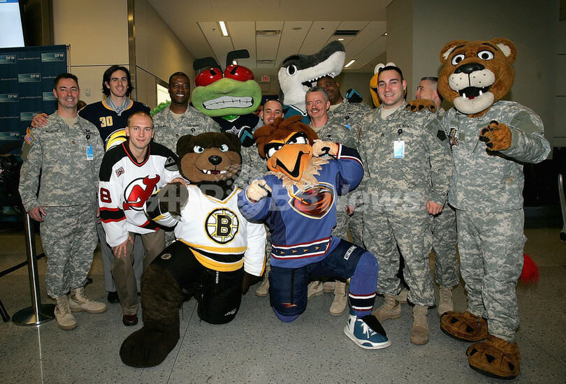 【ダラス/米国 23日 AFP】06-07NHL、24日に開催される第55回オールスター・ゲーム(55th NHL All-Star Game)に出場する選手らが、イラクとアフガニスタンの任務から休暇のため一時帰国した米軍兵士をダラス・フォートワース国際空港(Dallas-Fort Worth International Airport)で出迎えた。写真は、兵士を称えるゴーリーのマスクをデザインしたデヴィッド・アリゴ(David Arrigo)氏(左前)や各チームのマスコットと共に記念撮影を行う米国軍兵。(c)AFP/Getty Images Bruce Bennett