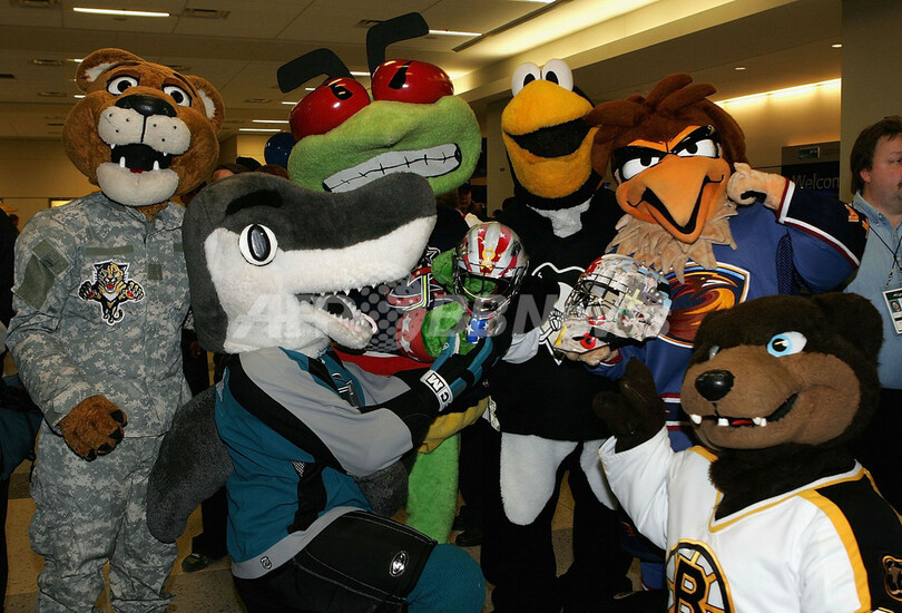 【ダラス/米国 23日 AFP】06-07NHL、24日に開催される第55回オールスター・ゲーム(55th NHL All-Star Game)に出場する選手らが、イラクとアフガニスタンの任務から休暇のため一時帰国した米軍兵士をダラス・フォートワース国際空港(Dallas-Fort Worth International Airport)で出迎えた。写真は、兵士を称えるゴーリーのマスクをデザインしたデヴィッド・アリゴ(David Arrigo)氏(左前)や各チームのマスコットと共に記念撮影を行う米国軍兵。(c)AFP/Getty Images Bruce Bennett
