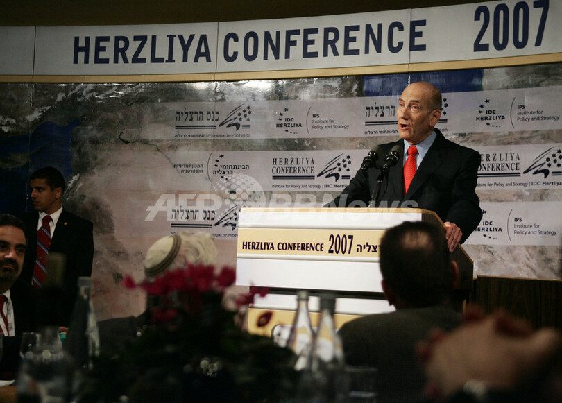 【ヘルツェリア/イスラエル 25日 AFP】エフド・オルメルト(Ehud Olmert)首相は24日、テルアビブ(Tel Aviv)近郊の都市ヘルツェリア(Herzliya)で演説し、強姦(ごうかん)罪などの容疑で検察当局が起訴する方針を固めたと発表したモシェ・カツァブ(Moshe Katsav)大統領に対し、辞任を勧告した。オルメルト首相は演説の冒頭で「現状では大統領の職務継続は困難」とし、大統領官邸から退去するよう求めた。写真は同日、ヘルツェリアの治安対策会議で政策演説するオルメルト首相。(c)AFP/Ariel SCHALIT