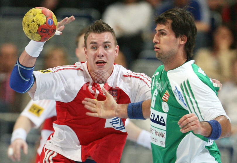 【マンハイム/ドイツ 24日 AFP】ハンドボール、男子ハンドボール世界選手権2007(Men’s Handball World Championship)、決勝ラウンド・グループ2、チェコvsハンガリー。ハンガリーのGergo Ivancsikは、この試合7ゴールを挙げる活躍でチームの勝利に貢献した。試合はハンガリーが28-25でチェコに勝利し、決勝ラウンド初戦を白星で飾った。写真はチェコのGK、Martin Galiaからゴールを奪うハンガリーのIvancsik(左)。(c)AFP/JACQUES DEMARTHON