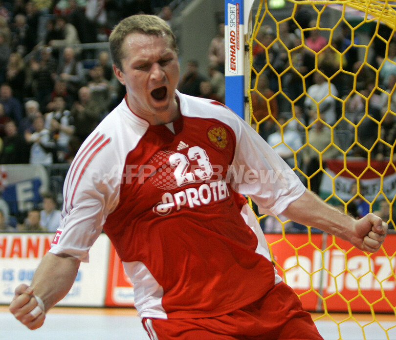 【マンハイム/ドイツ 25日 AFP】ハンドボール、男子ハンドボール世界選手権2007(Men’s Handball World Championship)、決勝ラウンド・グループ2、チェコvsロシア。ロシアのEduard Koksharovは、9得点を挙げ勝利に貢献した。試合は、ロシアが30-26でチェコを降し、決勝ラウンド初勝利を挙げた。写真は、得点を挙げ喜ぶKoksharov。(c)AFP/JACQUES DEMARTHON