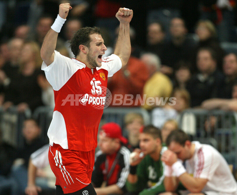 【マンハイム/ドイツ 25日 AFP】ハンドボール、男子ハンドボール世界選手権2007(Men’s Handball World Championship)、決勝ラウンド・グループ2、チェコvsロシア。ロシアのEduard Koksharovは、9得点を挙げ勝利に貢献した。試合は、ロシアが30-26でチェコを降し、決勝ラウンド初勝利を挙げた。写真は、得点を挙げ喜ぶKoksharov。(c)AFP/JACQUES DEMARTHON