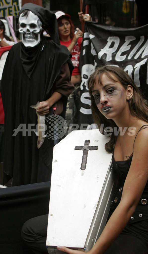 写真は25日、ブエノスアイレス にあるフィンランド大使館前で、棺桶を持って建設反対のデモを行う、環境保護団体の若者。(c)AFP