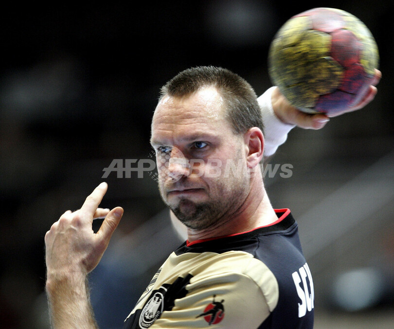【ドルトムント/ドイツ 25日 AFP】ハンドボール、男子ハンドボール世界選手権2007(Men’s Handball World Championship)、決勝ラウンド・グループ1、チュニジアvsドイツ。ドイツのパスカル・ヘンズ(Pascal Hens)は、この試合5ゴールを挙げる活躍でチームの勝利に貢献した。試合はドイツが35-28でチュニジアに勝利し、決勝ラウンド2連勝を飾った。写真は、勝利を決めてガッツポーズをするヘンズ。(c)AFP/PATRIK STOLLARZ