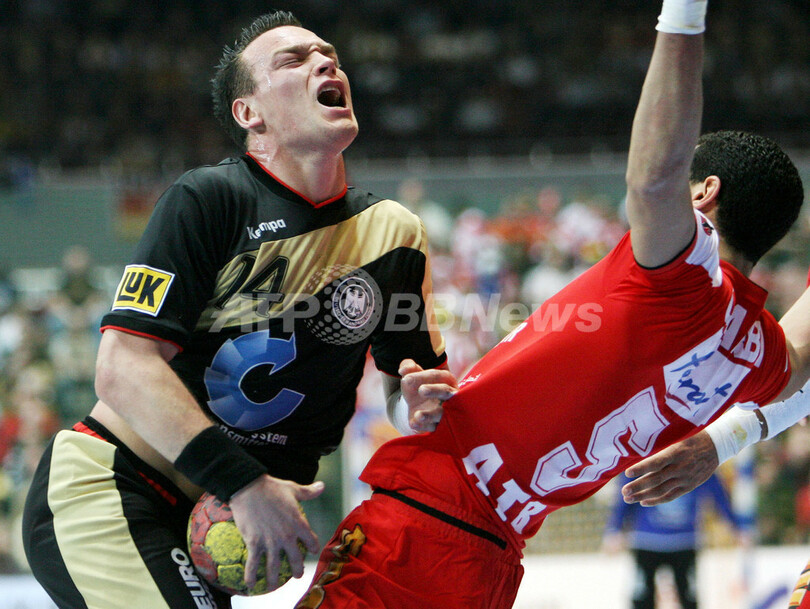 【ドルトムント/ドイツ 25日 AFP】ハンドボール、男子ハンドボール世界選手権2007(Men’s Handball World Championship)、決勝ラウンド・グループ1、チュニジアvsドイツ。ドイツのパスカル・ヘンズ(Pascal Hens)は、この試合5ゴールを挙げる活躍でチームの勝利に貢献した。試合はドイツが35-28でチュニジアに勝利し、決勝ラウンド2連勝を飾った。写真は、勝利を決めてガッツポーズをするヘンズ。(c)AFP/PATRIK STOLLARZ