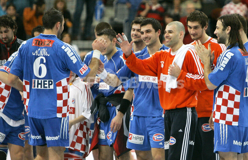 【マンハイム/ドイツ 25日 AFP】ハンドボール、男子ハンドボール世界選手権2007(Men’s Handball World Championship)、決勝ラウンド・グループ2、クロアチアvsハンガリー。クロアチアのGK、Dragan Jerkovicは35本中17本のシュートをセーブしチームの勝利に貢献した。試合はクロアチアが25-18で勝利し、決勝ラウンド2連勝を飾った。(c)AFP/JACQUES DEMARTHON