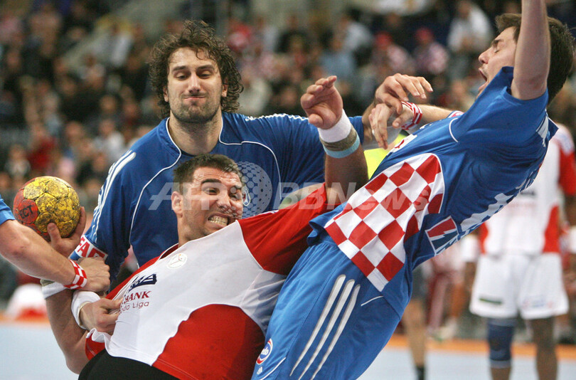 【マンハイム/ドイツ 25日 AFP】ハンドボール、男子ハンドボール世界選手権2007(Men’s Handball World Championship)、決勝ラウンド・グループ2、クロアチアvsハンガリー。クロアチアのGK、Dragan Jerkovicは35本中17本のシュートをセーブしチームの勝利に貢献した。試合はクロアチアが25-18で勝利し、決勝ラウンド2連勝を飾った。(c)AFP/JACQUES DEMARTHON