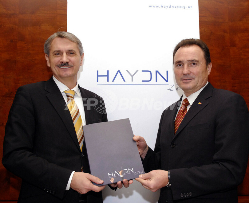【ウィーン/オーストリア 26日 AFP】古典派を代表するオーストリアの作曲家、フランツ・ヨーゼフ・ハイドン(Franz Joseph Haydn)を記念して毎年9月に開催されるハイドン・フェスティバル(The Haydn Festival)の2007年のプログラムが24日に行われた会見で発表された。同フェスティバルはハイドンだけでなく、彼に関わりのあった作曲家の作品が披露されるコンサートシリーズである。今年は9月6日から16日まで開催される。写真は同会見に出席した同フェスティバルの芸術監督Walter Reicher(左)と役員のHelmut Bielerさん。(c)AFP/SAMUEL KUBANI
