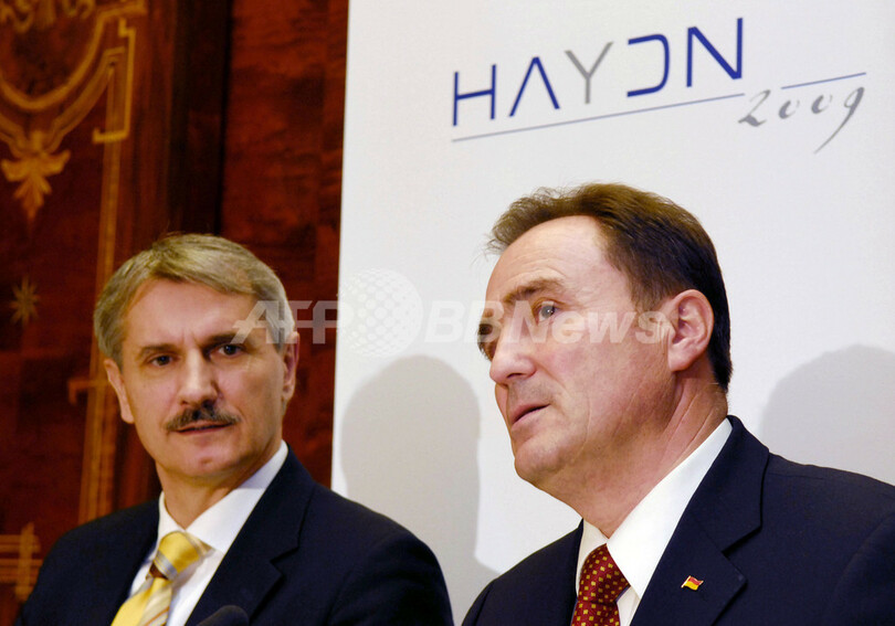 【ウィーン/オーストリア 26日 AFP】古典派を代表するオーストリアの作曲家、フランツ・ヨーゼフ・ハイドン(Franz Joseph Haydn)を記念して毎年9月に開催されるハイドン・フェスティバル(The Haydn Festival)の2007年のプログラムが24日に行われた会見で発表された。同フェスティバルはハイドンだけでなく、彼に関わりのあった作曲家の作品が披露されるコンサートシリーズである。今年は9月6日から16日まで開催される。写真は同会見に出席した同フェスティバルの芸術監督Walter Reicher(左)と役員のHelmut Bielerさん。(c)AFP/SAMUEL KUBANI