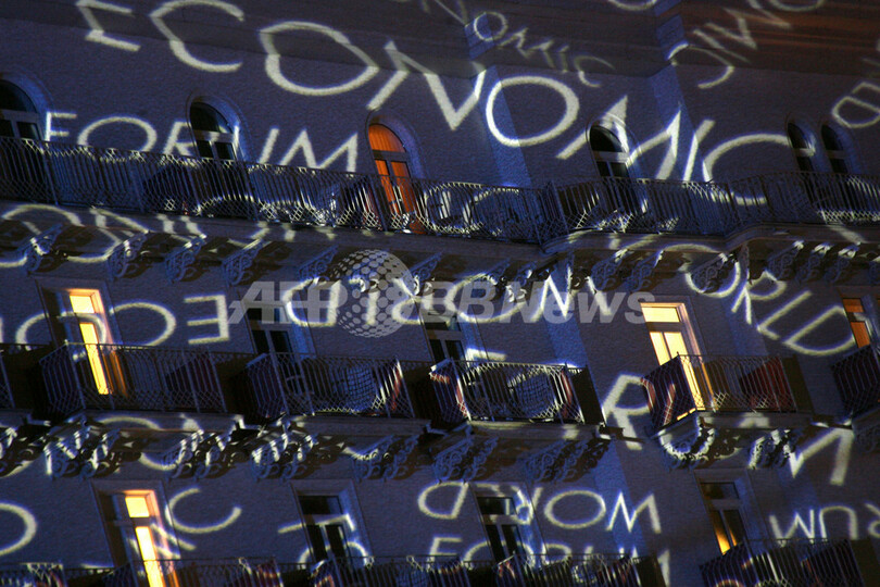 写真はダボスで24日、世界経済フォーラムの初日を迎えてライトアップされたホテル。(c)AFP/JOEL SAGET
