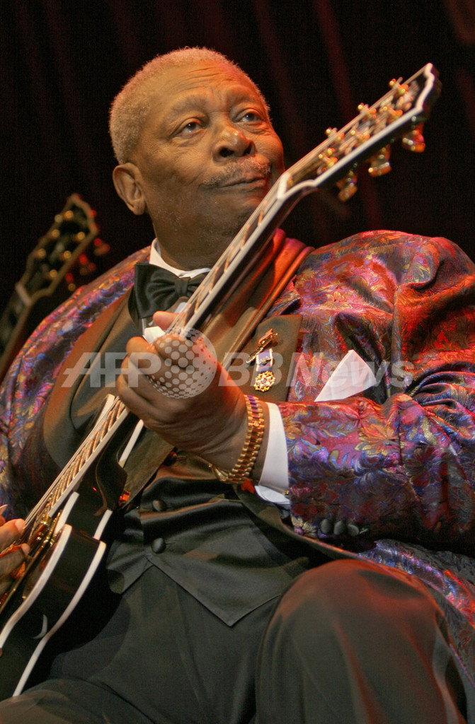 1947年にメンフィスで歌手としての活動を開始したB・B・キングは、60年間のキャリアで個人としては14個のグラミー賞を獲得。2006年にはワールドツアーを行なうなど、現在も精力的な活動を続けている。写真は60周年記念ツアーの皮切りライブでパフォーマンスを披露するB・B・キング(1月2日撮影)。(c)AFP/ROBYN BECK