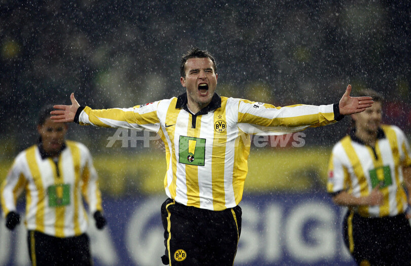 【ドルトムント/ドイツ 26日 AFP】サッカー、ドイツ・ブンデスリーガ・第18節、ボルシア・ドルトムント(Borussia Dortmund)vsバイエルン・ミュンヘン(Bayern Munich)。ドルトムントのアレクサンデル・フレイ(Alexander Frei)は、2得点(前半12分、後半12分)を挙げる活躍をみせチームの勝利に貢献した。試合は3-2でドルトムントが勝利し今シーズン6勝目を挙げた。写真は、ゴールを挙げて歓喜するフレイ。(c)AFP/DDP TORSTEN SILZ