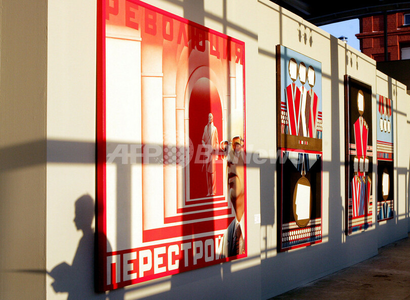 【モスクワ/ロシア 27日 AFP】オークションハウス、サザビーズ(Sotheby’s)は2月15日、旧ソ連のアーティストたちによるアート作品を集めたオークションを、ロンドンで開催する。同オークションには70年代から80年代にかけて制作された120点余りの作品が出品される。ロシアのアート作品への英国での関心は年代を問わず、非常に高いものがあり、昨年12月に行われた3日間のロシアアートのセールでは、2800万ポンド(約66億5000万円)の記録が打ち立てられた。写真はモスクワの街頭に掲げられた、同オークションに出品予定のErik Bulatovによる「Revolution-Perestroika」(左)とBoris Orlovによる「Iconostasis in imperial style」。(c)AFP/DENIS SINYAKOV