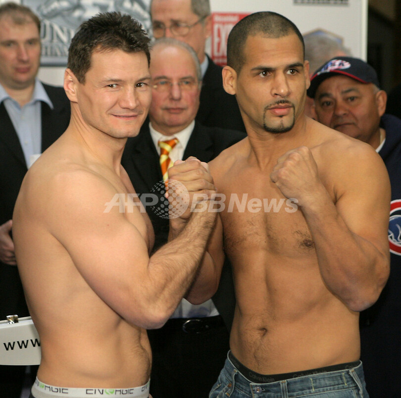 【デュッセルドルフ/ドイツ 26日 AFP】ボクシング、WBO世界ライトヘビー級タイトルマッチ12回戦を翌27日に控え、王者ゾルト・エルディ(Zsolt Erdei、ハンガリー)と挑戦者のダニー・サンチャゴ(Danny Santiago、米国)が前日計量に臨んだ。王者のエルディは、通算27戦27勝(15KO)無敗で、2004年1月17日に同タイトルを獲得して以来7度目の防衛戦となる。写真は、ポーズを取るエルディ(左)とサンチャゴ。(c)AFP/DDP/SASCHA SCHUERMANN