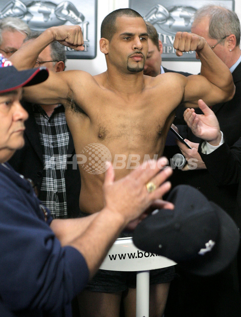 【デュッセルドルフ/ドイツ 26日 AFP】ボクシング、WBO世界ライトヘビー級タイトルマッチ12回戦を翌27日に控え、王者ゾルト・エルディ(Zsolt Erdei、ハンガリー)と挑戦者のダニー・サンチャゴ(Danny Santiago、米国)が前日計量に臨んだ。王者のエルディは、通算27戦27勝(15KO)無敗で、2004年1月17日に同タイトルを獲得して以来7度目の防衛戦となる。写真は、ポーズを取るエルディ(左)とサンチャゴ。(c)AFP/DDP/SASCHA SCHUERMANN