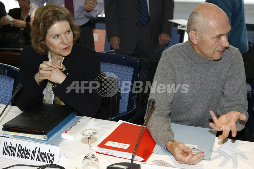 写真は非公式会合の前にスーザン・シュワブ(Susan Schwab)米通商代表と並んで座るラミー事務局長(右)。(c)AFP/LAURENT GILLIERON