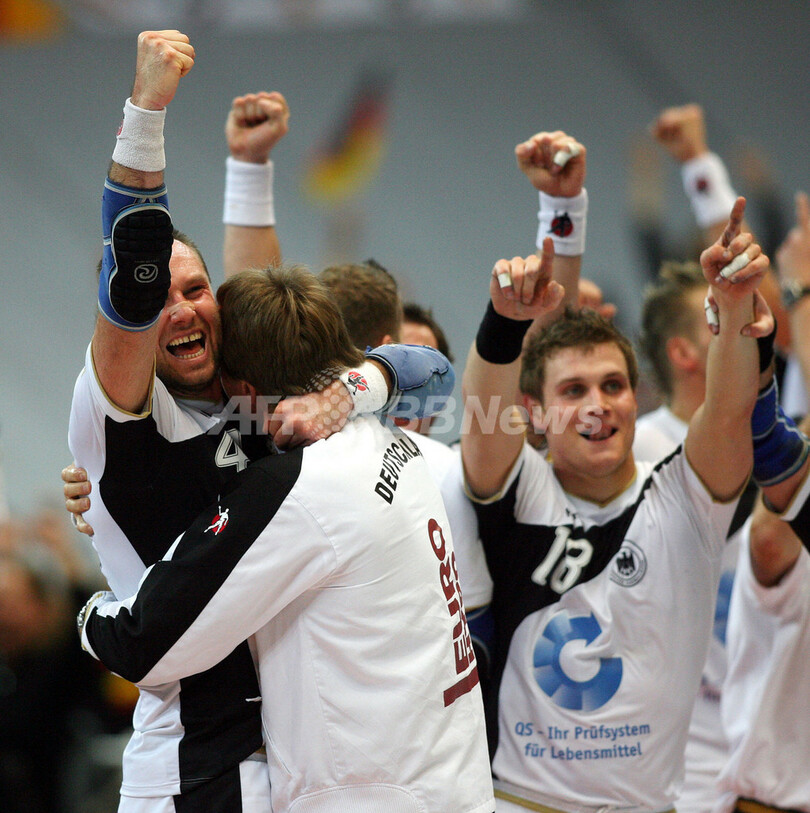【ドルトムント/ドイツ 27日 AFP】ハンドボール、男子ハンドボール世界選手権2007(Men’s Handball World Championship)、決勝ラウンド・グループ1、ドイツvsフランス。試合はドイツが29-26でフランスを降し、決勝ラウンド・グループ1で3連勝を飾りグループ1位に浮上した。写真はフランスを破り歓喜するドイツの選手達。(c)AFP/PATRIK STOLLARZ