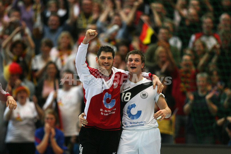 【ドルトムント/ドイツ 27日 AFP】ハンドボール、男子ハンドボール世界選手権2007(Men’s Handball World Championship)、決勝ラウンド・グループ1、ドイツvsフランス。試合はドイツが29-26でフランスを降し、決勝ラウンド・グループ1で3連勝を飾りグループ1位に浮上した。写真はフランスを破り歓喜するドイツの選手達。(c)AFP/PATRIK STOLLARZ