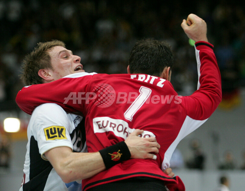 【ドルトムント/ドイツ 27日 AFP】ハンドボール、男子ハンドボール世界選手権2007(Men’s Handball World Championship)、決勝ラウンド・グループ1、ドイツvsフランス。試合はドイツが29-26でフランスを降し、決勝ラウンド・グループ1で3連勝を飾りグループ1位に浮上した。写真はフランスを破り歓喜するドイツの選手達。(c)AFP/PATRIK STOLLARZ