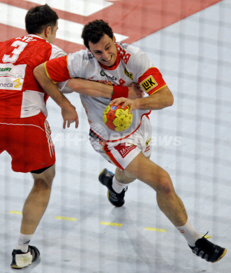 【マンハイム/ドイツ 27日 AFP】ハンドボール、男子ハンドボール世界選手権2007(Men’s Handball World Championship)、決勝ラウンド・グループ2、スペインvsハンガリー。試合はスペインが33-31でハンガリーを降し決勝ラウンド2勝目を飾った。写真は、シュートを放つスペインのJose Maria Vaquero。(c)AFP/JOHN MACDOUGALL