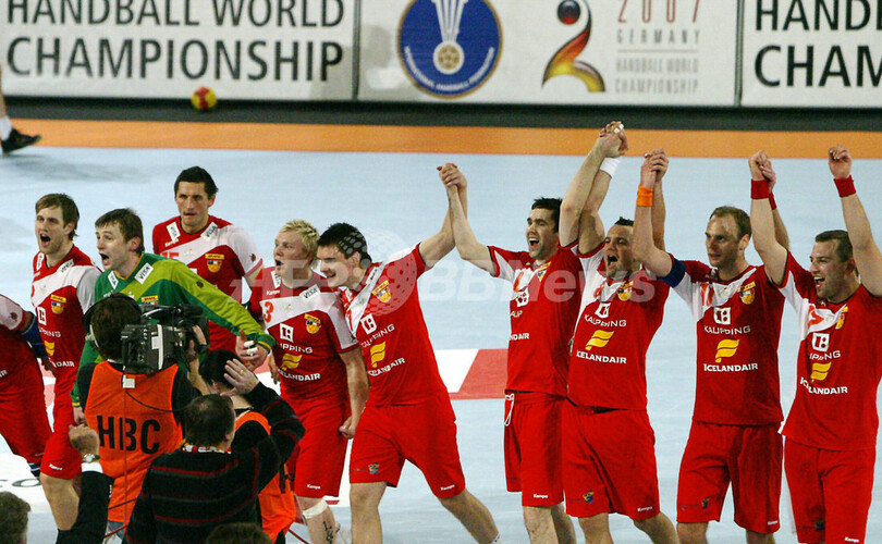 【ハレ/ドイツ 27日 AFP】ハンドボール、男子ハンドボール世界選手権2007(Men’s Handball World Championship)、決勝ラウンド・グループ1、アイスランドvsスロベニア。試合はアイスランドが33-31でスロベニアを降し、決勝ラウンド2勝目を飾った。写真は、勝利に歓喜するアイスランドの選手達。(c)AFP/ATTILA KISBENEDEK