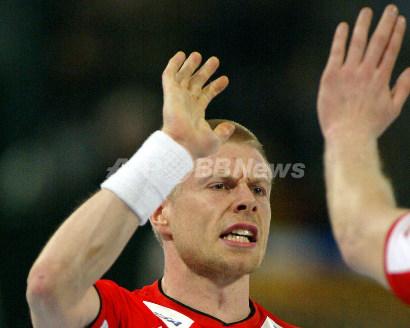 【ハレ/ドイツ 27日 AFP】ハンドボール、男子ハンドボール世界選手権2007(Men’s Handball World Championship)、決勝ラウンド・グループ1、アイスランドvsスロベニア。試合はアイスランドが33-31でスロベニアを降し、決勝ラウンド2勝目を飾った。写真は、勝利に歓喜するアイスランドの選手達。(c)AFP/ATTILA KISBENEDEK