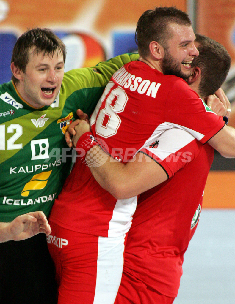 【ハレ/ドイツ 27日 AFP】ハンドボール、男子ハンドボール世界選手権2007(Men’s Handball World Championship)、決勝ラウンド・グループ1、アイスランドvsスロベニア。試合はアイスランドが33-31でスロベニアを降し、決勝ラウンド2勝目を飾った。写真は、勝利に歓喜するアイスランドの選手達。(c)AFP/ATTILA KISBENEDEK