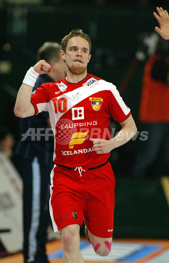 【ハレ/ドイツ 27日 AFP】ハンドボール、男子ハンドボール世界選手権2007(Men’s Handball World Championship)、決勝ラウンド・グループ1、アイスランドvsスロベニア。試合はアイスランドが33-31でスロベニアを降し、決勝ラウンド2勝目を飾った。写真は、勝利に歓喜するアイスランドの選手達。(c)AFP/ATTILA KISBENEDEK