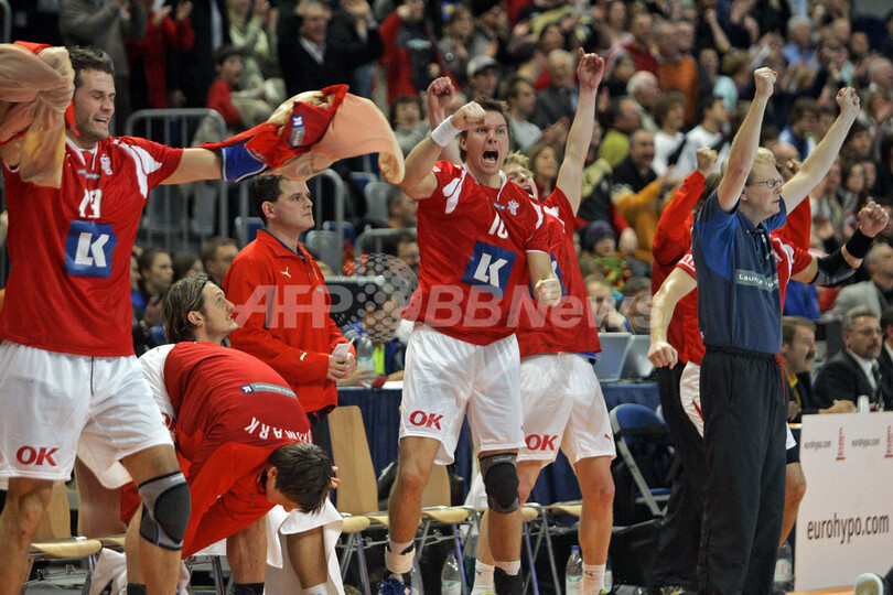 【マンハイム/ドイツ 27日 AFP】ハンドボール、男子ハンドボール世界選手権2007(Men’s Handball World Championship)、決勝ラウンド・グループ2、デンマークvsロシア。試合はデンマークが26-24でロシアを降し決勝ラウンド2勝目を飾った。写真は、勝利に歓喜するデンマークの選手たち。(c)AFP/JACQUES DEMARTHON
