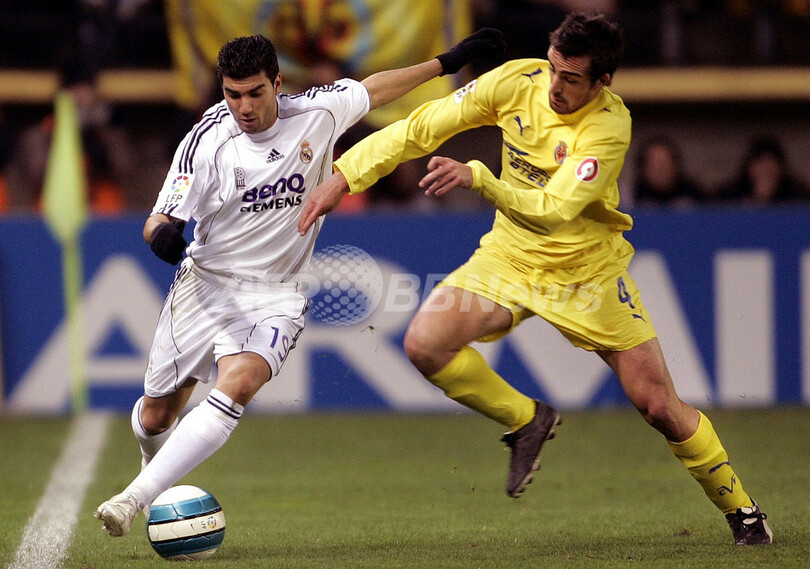 【ビジャレアル/スペイン 27日 AFP】サッカースペイン・リーガエスパニョーラ1部・第20節、ビジャレアル(Villarreal)vsレアル・マドリード(Real Madrid)。試合はビジャレアルが後半23分にマルコス(Marcos Garcia)のゴールで先制し1-0でレアル・マドリードを降し、シーズン8勝目を挙げ勝ち点を29に伸ばした。写真は、レアル・マドリードのホセ・アントニオ・レイェス(Jose Antonio Reyes、左)をマークするビジャレアルのホセ・エンリケ(Jose Enrique)。(c)AFP/JOSE JORDAN