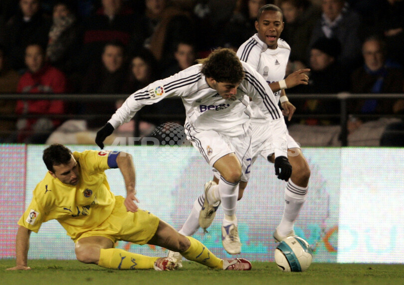 【ビジャレアル/スペイン 27日 AFP】サッカースペイン・リーガエスパニョーラ1部・第20節、ビジャレアル(Villarreal)vsレアル・マドリード(Real Madrid)。試合はビジャレアルが後半23分にマルコス(Marcos Garcia)のゴールで先制し1-0でレアル・マドリードを降し、シーズン8勝目を挙げ勝ち点を29に伸ばした。写真は、レアル・マドリードのホセ・アントニオ・レイェス(Jose Antonio Reyes、左)をマークするビジャレアルのホセ・エンリケ(Jose Enrique)。(c)AFP/JOSE JORDAN