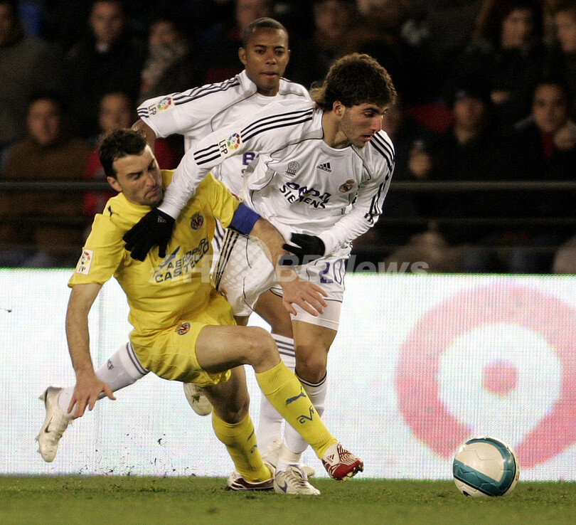 【ビジャレアル/スペイン 27日 AFP】サッカースペイン・リーガエスパニョーラ1部・第20節、ビジャレアル(Villarreal)vsレアル・マドリード(Real Madrid)。試合はビジャレアルが後半23分にマルコス(Marcos Garcia)のゴールで先制し1-0でレアル・マドリードを降し、シーズン8勝目を挙げ勝ち点を29に伸ばした。写真は、レアル・マドリードのホセ・アントニオ・レイェス(Jose Antonio Reyes、左)をマークするビジャレアルのホセ・エンリケ(Jose Enrique)。(c)AFP/JOSE JORDAN