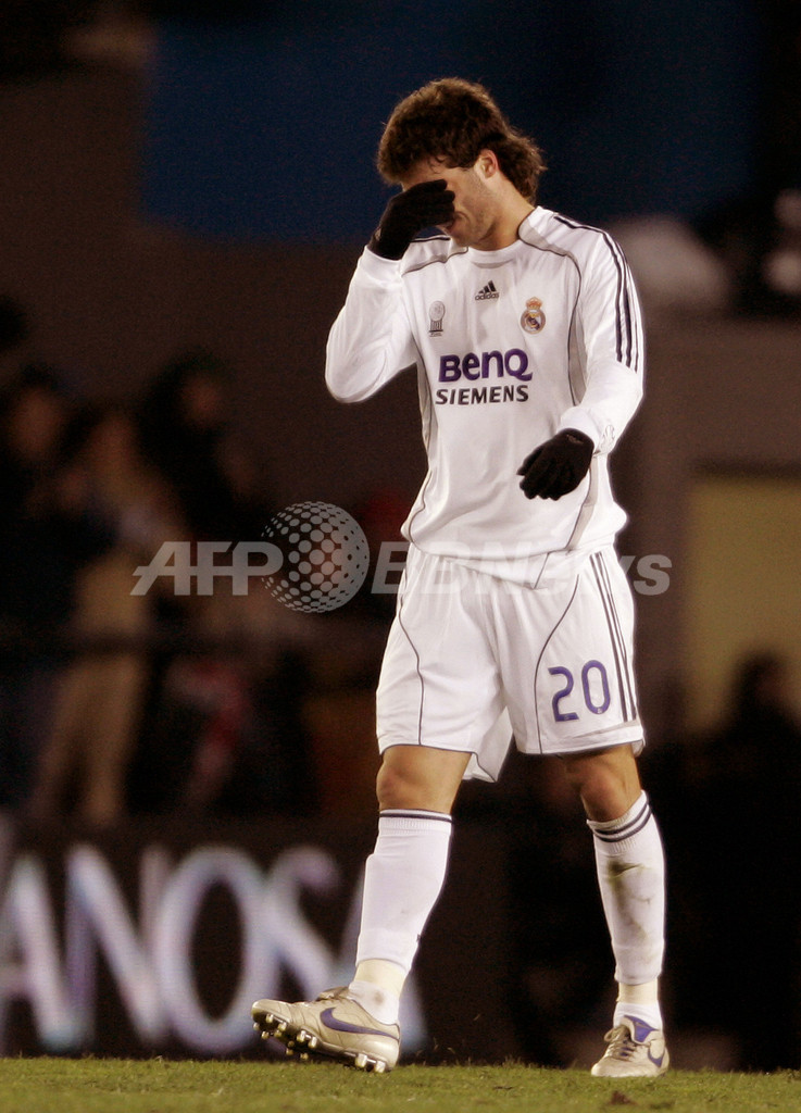 【ビジャレアル/スペイン 27日 AFP】サッカースペイン・リーガエスパニョーラ1部・第20節、ビジャレアル(Villarreal)vsレアル・マドリード(Real Madrid)。試合はビジャレアルが後半23分にマルコス(Marcos Garcia)のゴールで先制し1-0でレアル・マドリードを降し、シーズン8勝目を挙げ勝ち点を29に伸ばした。写真は、レアル・マドリードのホセ・アントニオ・レイェス(Jose Antonio Reyes、左)をマークするビジャレアルのホセ・エンリケ(Jose Enrique)。(c)AFP/JOSE JORDAN