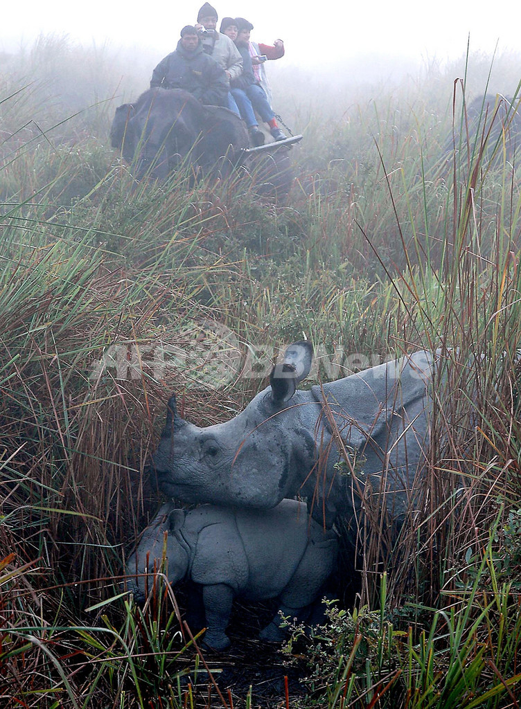 【ガウハティ/インド 28日 AFP】希少な1角サイの子ども2頭が28日、繁殖活動を促進する目的のため、過密状態だった北東部アッサム(Assam)州の自然保護区から別の保護区へと移動された。野生動物管理当局の関係者によると、2頭のメスのサイ(3歳6か月)は、世界で最も1角サイの生息密度が高い同州東部のガジランガ国立公園(Kaziranga National Park)から別々のトラックに乗せられ移送された。写真は27日、ガウハティ(Guwahati)から約285キロメートルのガジランガ国立公園で、ゾウに乗ってサイの親子を眺める観光客たち。(c)AFP