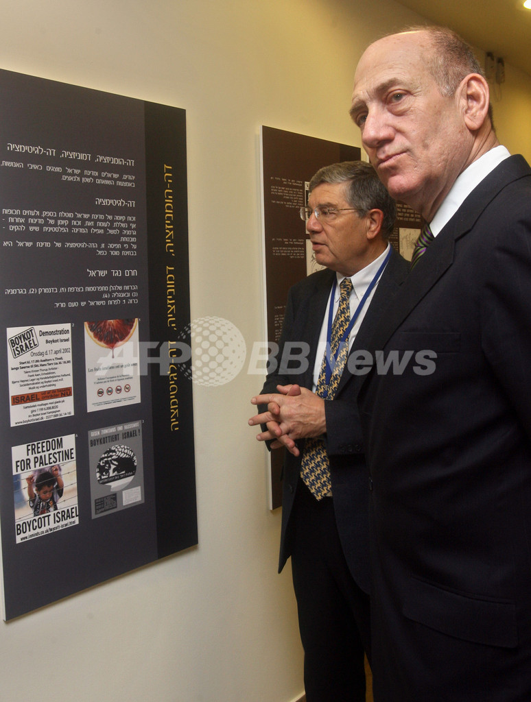 【エルサレム/イスラエル 28日 AFP】エルサレム(Jerusalem)で28日、定例の閣僚会議が開かれた。同会議の中で反ユダヤ主義について触れたエフド・オルメルト(Ehud Olmert)首相は、イランについて「イスラエルの滅亡を求める国家との対立を、世界が避けることをわが国は容認しないだろう」と述べた。写真は同日、議長を務める閣僚会議前に、首相執務室で反ユダヤ主義についての展示物を眺めるオルメルト首相。(c)AFP/JIM HOLLANDER