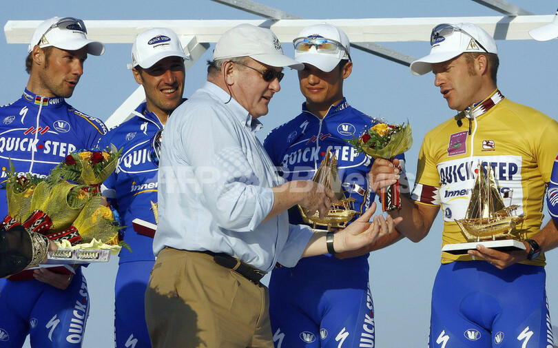 【ドーハ/カタール 28日 AFP】自転車レース、第6回ツアー・オブ・カタール(6th Tour of Qatar)、第1ステージ・チームタイムトライアル(ドーハ市内、6キロメートル)。クイックステップ・イネルゲティク(Quick Step-Innergetic)のステフェン・ドゥヨンフ(Steven de Jongh、オランダ)は、トップでフィニッシュして初日のステージ優勝を果たした。(c)AFP/FRANCK FIFE