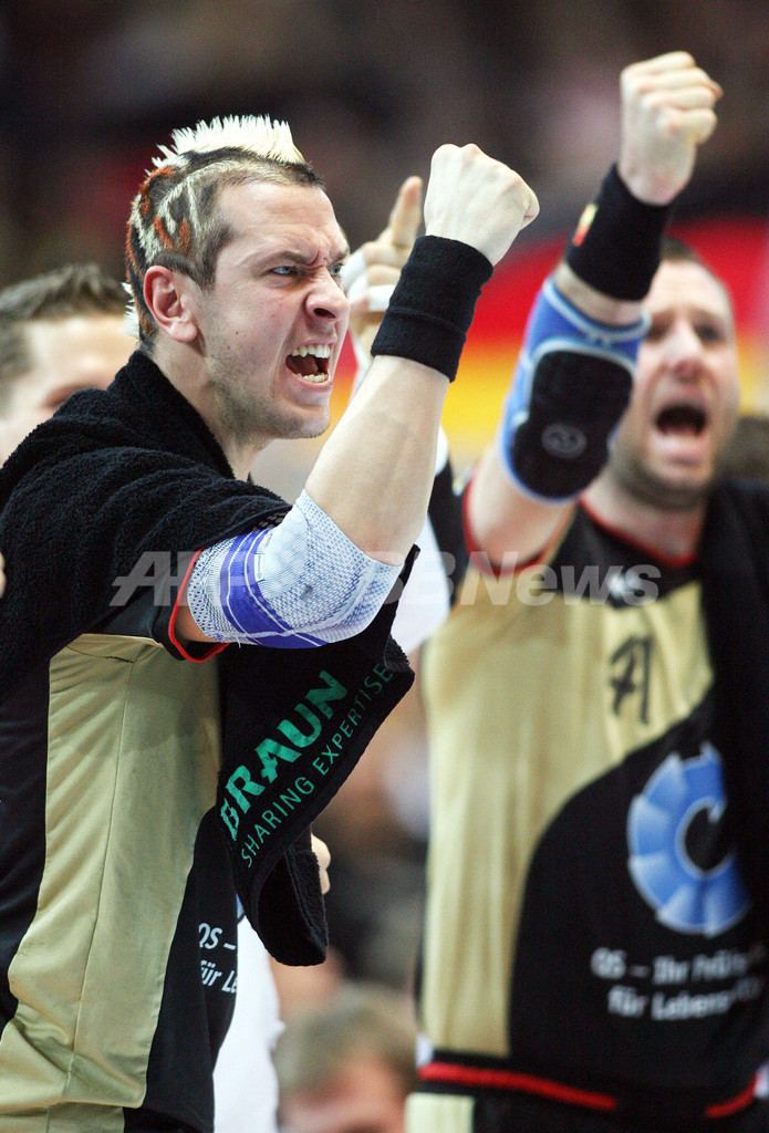 【ドルトムント/ドイツ 28日 AFP】ハンドボール、男子ハンドボール世界選手権2007(Men’s Handball World Championship)、決勝ラウンド・グループ1、ドイツvsアイスランド。ドイツのパスカル・ヘンズ(Pascal Hens)は、6ゴールを挙げる活躍でチームの勝利に貢献した。試合はドイツが33-28でアイスランドに勝利し、通算成績4勝1敗のグループ2位で決勝ラウンドを終えた。ドイツは30日に行われる準々決勝でスペインと対戦する。写真は、勝利を喜ぶヘンズ(左)。(c)AFP/DDP PATRIK STOLLARZ