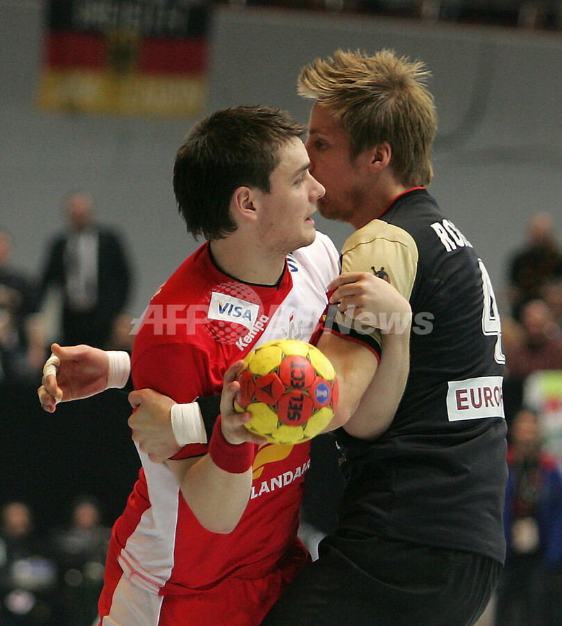 【ドルトムント/ドイツ 28日 AFP】ハンドボール、男子ハンドボール世界選手権2007(Men’s Handball World Championship)、決勝ラウンド・グループ1、ドイツvsアイスランド。ドイツのパスカル・ヘンズ(Pascal Hens)は、6ゴールを挙げる活躍でチームの勝利に貢献した。試合はドイツが33-28でアイスランドに勝利し、通算成績4勝1敗のグループ2位で決勝ラウンドを終えた。ドイツは30日に行われる準々決勝でスペインと対戦する。写真は、勝利を喜ぶヘンズ(左)。(c)AFP/DDP PATRIK STOLLARZ