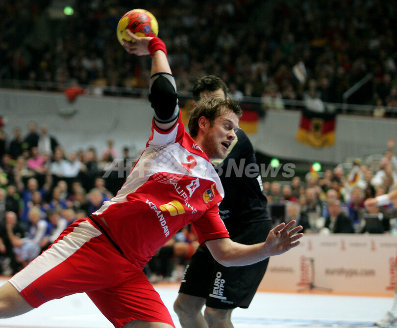 【ドルトムント/ドイツ 28日 AFP】ハンドボール、男子ハンドボール世界選手権2007(Men’s Handball World Championship)、決勝ラウンド・グループ1、ドイツvsアイスランド。ドイツのパスカル・ヘンズ(Pascal Hens)は、6ゴールを挙げる活躍でチームの勝利に貢献した。試合はドイツが33-28でアイスランドに勝利し、通算成績4勝1敗のグループ2位で決勝ラウンドを終えた。ドイツは30日に行われる準々決勝でスペインと対戦する。写真は、勝利を喜ぶヘンズ(左)。(c)AFP/DDP PATRIK STOLLARZ