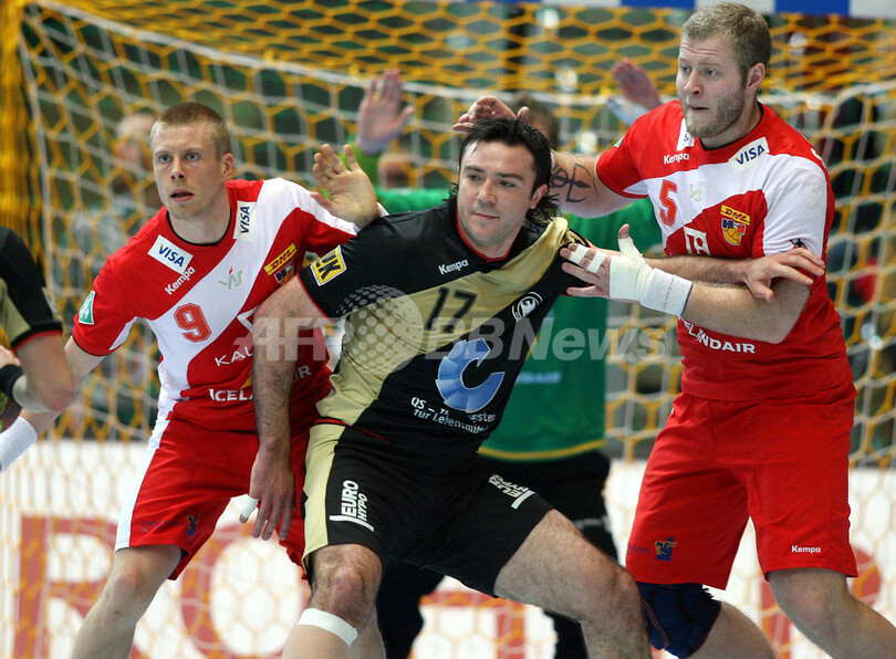 【ドルトムント/ドイツ 28日 AFP】ハンドボール、男子ハンドボール世界選手権2007(Men’s Handball World Championship)、決勝ラウンド・グループ1、ドイツvsアイスランド。ドイツのパスカル・ヘンズ(Pascal Hens)は、6ゴールを挙げる活躍でチームの勝利に貢献した。試合はドイツが33-28でアイスランドに勝利し、通算成績4勝1敗のグループ2位で決勝ラウンドを終えた。ドイツは30日に行われる準々決勝でスペインと対戦する。写真は、勝利を喜ぶヘンズ(左)。(c)AFP/DDP PATRIK STOLLARZ