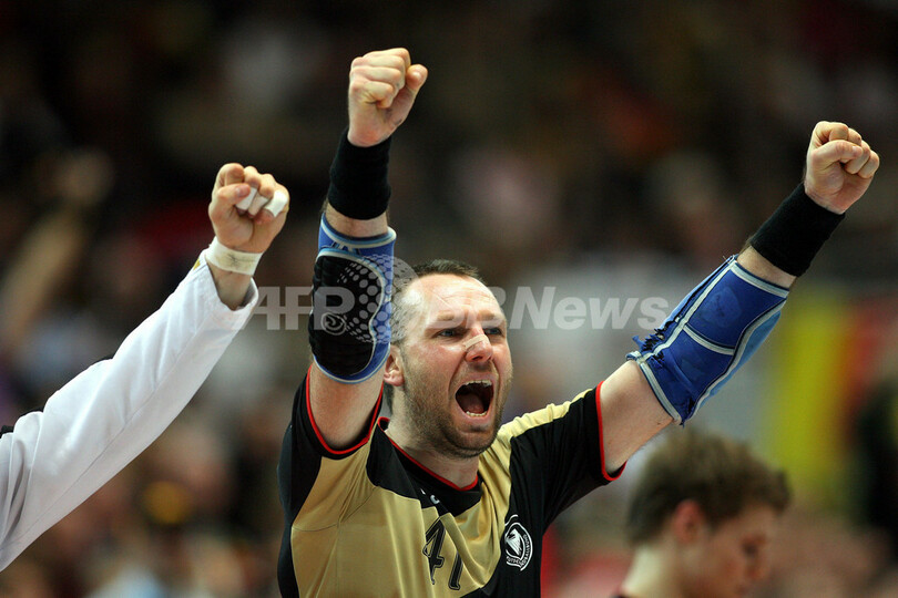 【ドルトムント/ドイツ 28日 AFP】ハンドボール、男子ハンドボール世界選手権2007(Men’s Handball World Championship)、決勝ラウンド・グループ1、ドイツvsアイスランド。ドイツのパスカル・ヘンズ(Pascal Hens)は、6ゴールを挙げる活躍でチームの勝利に貢献した。試合はドイツが33-28でアイスランドに勝利し、通算成績4勝1敗のグループ2位で決勝ラウンドを終えた。ドイツは30日に行われる準々決勝でスペインと対戦する。写真は、勝利を喜ぶヘンズ(左)。(c)AFP/DDP PATRIK STOLLARZ