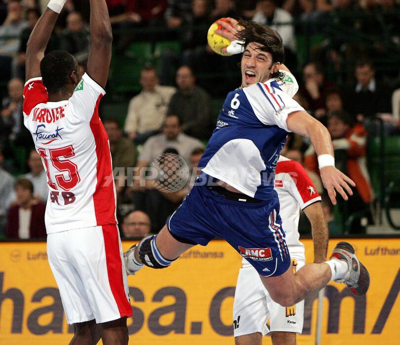 【ハレ/ドイツ 28日 AFP】ハンドボール、男子ハンドボール世界選手権2007(Men’s Handball World Championship)、決勝ラウンド・グループ1、フランスvsチュニジア。フランスのベルナルド・ジレ(Bertrand Gille)は、この試合4ゴールを挙げる活躍でチームの勝利に貢献した。試合はフランスが28-26でチュニジアとの接戦を制し、通算成績3勝2敗のグループ4位で決勝ラウンドを終えた。フランスは30日に行われる準々決勝でクロアチアと対戦する。写真は、チュニジアのAhmed Hadjにブロックを受けながらもシュートを放つGille(右)。(c)AFP/ATTILA KISBENEDEK