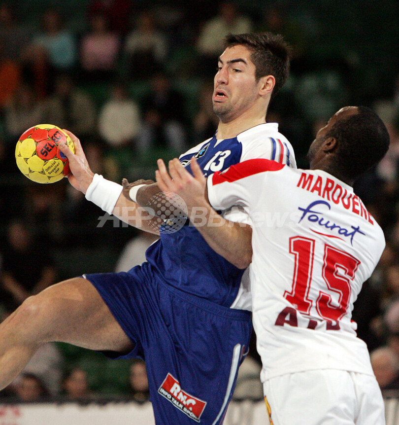 【ハレ/ドイツ 28日 AFP】ハンドボール、男子ハンドボール世界選手権2007(Men’s Handball World Championship)、決勝ラウンド・グループ1、フランスvsチュニジア。フランスのベルナルド・ジレ(Bertrand Gille)は、この試合4ゴールを挙げる活躍でチームの勝利に貢献した。試合はフランスが28-26でチュニジアとの接戦を制し、通算成績3勝2敗のグループ4位で決勝ラウンドを終えた。フランスは30日に行われる準々決勝でクロアチアと対戦する。写真は、チュニジアのAhmed Hadjにブロックを受けながらもシュートを放つGille(右)。(c)AFP/ATTILA KISBENEDEK