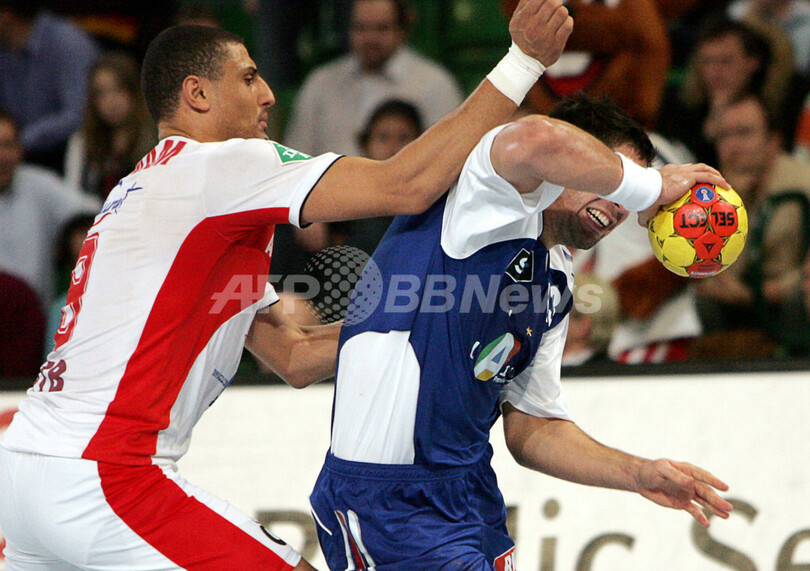 【ハレ/ドイツ 28日 AFP】ハンドボール、男子ハンドボール世界選手権2007(Men’s Handball World Championship)、決勝ラウンド・グループ1、フランスvsチュニジア。フランスのベルナルド・ジレ(Bertrand Gille)は、この試合4ゴールを挙げる活躍でチームの勝利に貢献した。試合はフランスが28-26でチュニジアとの接戦を制し、通算成績3勝2敗のグループ4位で決勝ラウンドを終えた。フランスは30日に行われる準々決勝でクロアチアと対戦する。写真は、チュニジアのAhmed Hadjにブロックを受けながらもシュートを放つGille(右)。(c)AFP/ATTILA KISBENEDEK