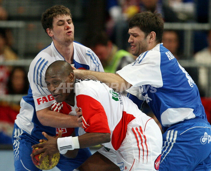 【マンハイム/ドイツ 28日 AFP】ハンドボール、男子ハンドボール世界選手権2007(Men’s Handball World Championship)、決勝ラウンド・グループ2、ロシアvsハンガリー。試合はロシアが26-25で勝利した。ロシアは通算成績2勝3敗でハンガリーと並び当該チーム同士の勝敗によりグループ4位で決勝ラウンドを終え準々決勝進出を決めた。ロシアは30日にポーランドと対戦する。写真は、勝利を決めてチームメイトのEduard Koksharov(手前)と喜びを分かち合うロシアのGK、Alexey Kostygov。(c)AFP/JOHN MACDOUGALL