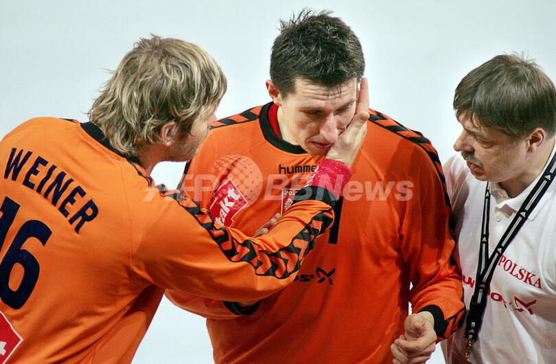 【ハレ/ドイツ 28日 AFP】ハンドボール、男子ハンドボール世界選手権2007(Men’s Handball World Championship)、決勝ラウンド・グループ1、スロベニアvsポーランド。ポーランドのGK、Slawomir Szmalは43本中17本のシュートをセーブしチームの勝利に貢献した。試合はポーランドが38-27でスロベニアに勝利し、通算成績4勝1敗のグループ首位で決勝ラウンドを終えた。ポーランドは30日に行われる準々決勝でロシアと対戦する。写真は、スロベニアのSiarhei RutenkaのシュートをセーブするSzmal。(c)AFP/ATTILA KISBENEDEK