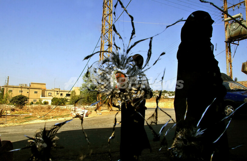 写真は2006年9月20日、クラスタ-爆弾で穴の空いた美容院のガラス越しに立つ親子。(c)AFP/MARWAN NAAMANI